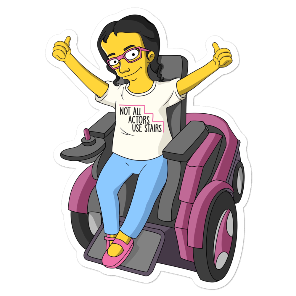 A yellow cartoon drawing or illustration of Esperanza (Dion's best friend) in her wheelchair from the Netflix live action show Raising Dion with a shirt that says "Not All Actors Use Stairs".